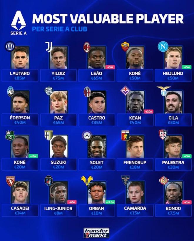 北京时间4月6日,德转列出了意甲20家俱乐部各自身价最高的球员,劳塔罗8500万欧元居首,凯南-伊尔迪兹、莱奥、霍伊伦上榜,克雷莫内塞的邦多750万欧元排名末尾。